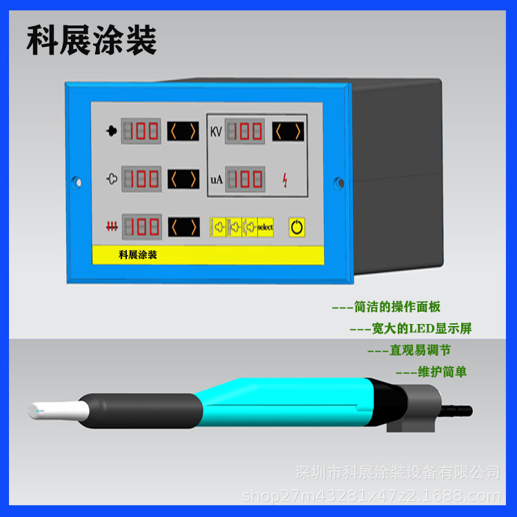 科展粉体自动静电喷枪具有丰富的个性化定制,一台主机可以控制多台喷枪,枪身全参数过程操控,减少热量能够延长设备的寿命,同时储存100组数据,页面操作简单清晰。